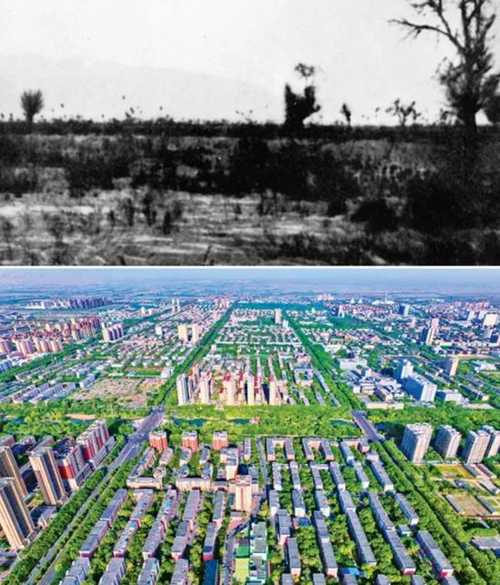 经过兵团人70年不懈奋斗,一座座美丽的军垦新城在戈壁荒原上拔地而起,形成具有兵团特色的城镇体系。上图为20世纪50年代,石河子市开发前的面貌(新疆兵团军垦博物馆供图);下图为2024年5月15日拍摄的石河子市城区(新华社记者 胡虎虎/摄)。