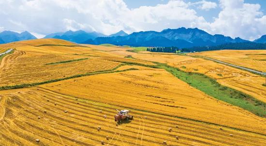 农业作为兵团的基础产业和优势产业,在保障我国粮食安全和重要农产品供给方面作出了重要贡献。图为2024年8月26日,在兵团第六师奇台农场的麦田里,收割机正在采收小麦。人民图片 李华北/摄