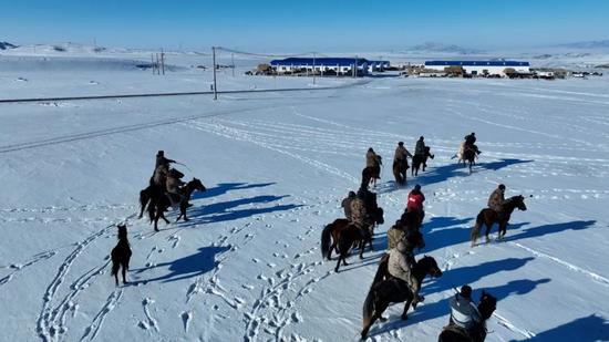 北塔山牧场畜牧三连距离乌拉斯台口岸6公里,距离蒙古国北塔格口岸21公里。记者近日来到这里,正巧碰上牧民策马扬鞭、赶着去参加叼羊比赛。