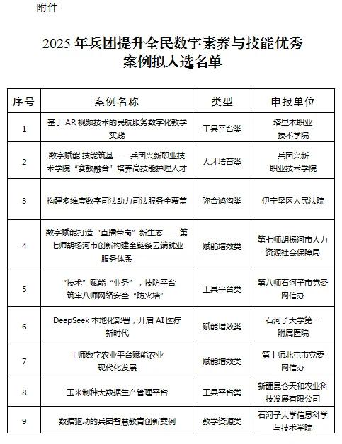 2025年兵团提升全民数字素养与技能优秀案例拟入选名单公示