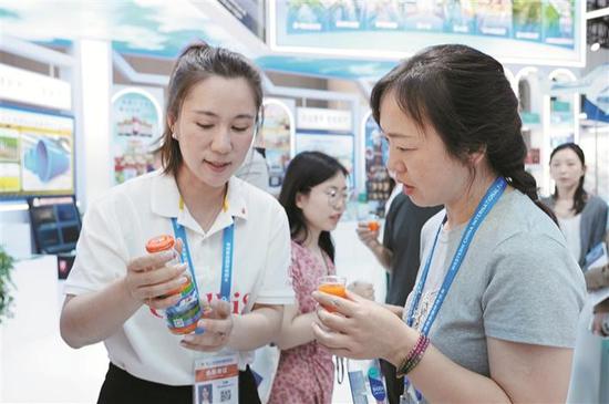 5月27日,第二十届中国西部国际博览会兵团展区特色农产品展台前人流如织,冻干红枣、油莎豆豆浆、西梅原浆等特色产品吸引了不少采购商关注、咨询和订购。