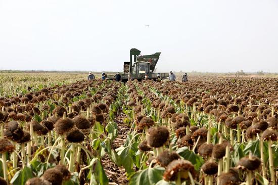 改良后的土地从2023年开始大规模种植棉花,产量逐年跃升。除了棉花,这片曾经的荒碱地还长出了玉米、小麦、食葵和大豆。目前,3000亩食葵正在收获,预计亩产超过250公斤,每亩可盈利五六百元。