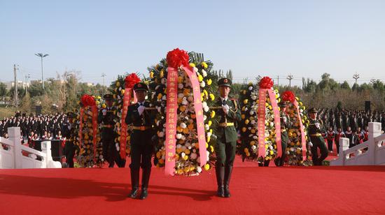 在烈士纪念碑前,中国共产党第一师阿拉尔市委员会、阿拉尔市人民代表大会常务委员会、阿拉尔市人民政府、中国人民政治协商会议阿拉尔市委员会、驻第一师阿拉尔市解放军和武警部队、塔里木大学等社会各界敬献的5个花篮一字排开,花篮的红色缎带上写着“烈士永垂不朽”。在庄重舒缓的《献花曲》中,10名礼兵稳稳抬起花篮,正步缓慢走向纪念碑,将花篮整齐摆放在纪念碑基座上。随后,全体人员依次缓步绕行,瞻仰烈士纪念碑和烈士英名墙并敬献鲜花,深切缅怀革命先烈,向人民英雄致敬。