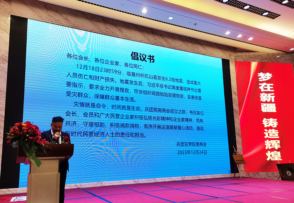 活动上,新疆兵团甘肃陇南商会还发出倡议,号召各位会长、会员和广大民营企业家积极弘扬光彩精神和企业家精神,为甘肃省临夏州积石山县地震灾区捐款捐物。