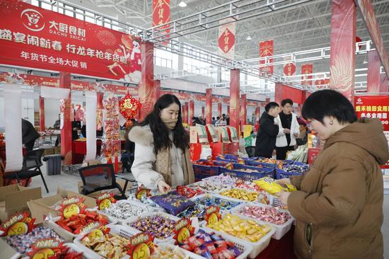 琳琅满目的年货,与现场来来往往的人流汇聚在一起,形成一幅热闹的烟火新春景象,让前来消费的市民赞不绝口。(乔建林)