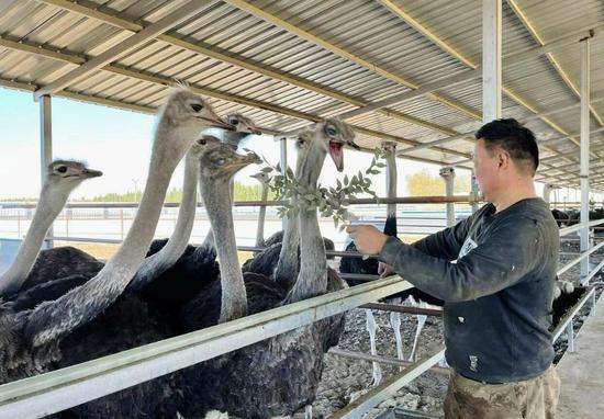 一四九团十五连养殖户杨青龙正忙着给养殖基地的100多只鸵鸟喂草,一只只膘肥体壮的鸵鸟埋头大快朵颐。杨青龙介绍说:“2022年我引进了100只小鸵鸟,建了一座标准化圈舍,鸵鸟抗病力强,耐粗饲养、成本低,自己对鸵鸟特色养殖的市场前景非常有信心。”