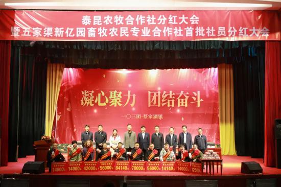 当日,刚满周岁的五家渠新亿园畜牧农民专业合作社召开首批社员分红大会,拿出首笔利润中的245.868万元为社员分红,其余社员和王路文一样按入社资金额也收到了分红。