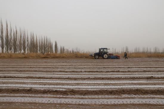 记者走进五团沙河镇十二连职工孙军的地里,播种机正来回作业,一粒粒孜然种子被播撒进田地里。