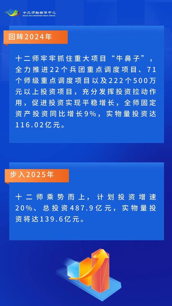 抓项目开复工:2024年11月至2025年3月,十二师开展项目建设“冬季攻势”活动,涵盖项目建设、前期工作、要素保障、服务项目等攻坚行动,统筹推进一批重大项目加速建设。2024年11至12月已完成固定资产投资约16亿元,力争2025年一季度固定资产投资同比增长15%左右,实现首季“开门红”。按照项目建设目标,续建项目需在2025年3月底前全部复工建设,新建项目在3月底前50%要具备开工条件。