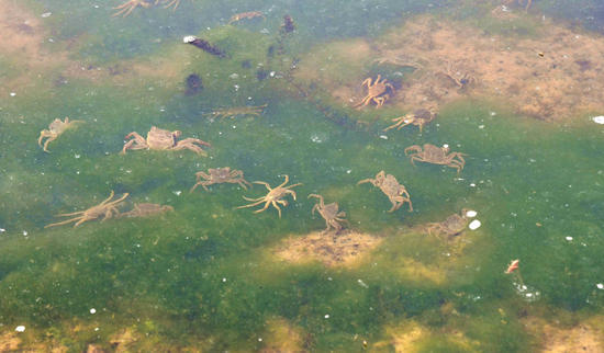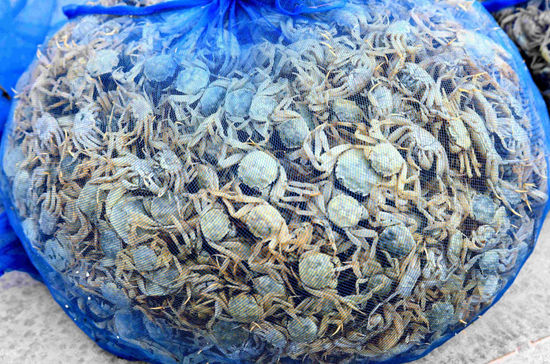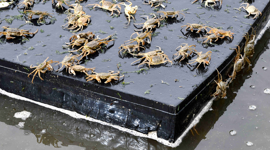 工人们将一箱箱蟹苗搬下后及时送往各塘口,经短暂过水后,随后拉开装蟹袋,将蟹苗倾倒入蟹塘。一群色泽鲜润、行动敏捷的小蟹争先恐后涌出,一入水便四散疾行,转瞬隐入塘中密布的水草间。