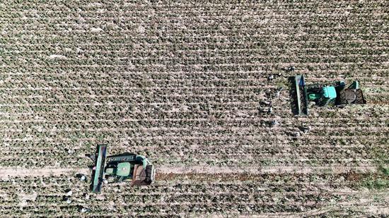 近日,在新疆兵团第一师阿拉尔市六团双城镇十一连一片含碱量较高的地里,50余名工人一边收割食葵,一边往大型机器里投放晒干的食葵开展脱粒工作,随后运输车辆将这些食葵籽拉到集中清选场地进行打包。