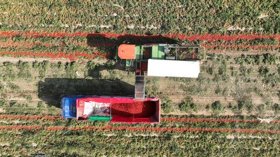 8月上旬起,新疆生产建设兵团第九师一六三团2000亩酱用番茄进入机械化集中采收期,预计总产量将突破2万吨。
