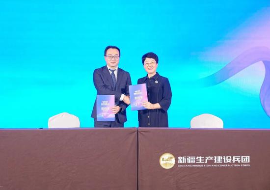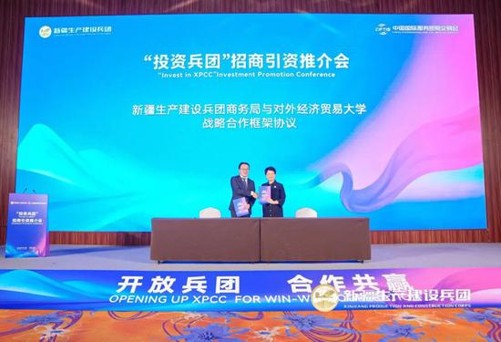 兵团商务局党组成员、副局长王旭阳,对外经济贸易大学副校长兼党委副书记文君共同签约。(来源/自贸试验区兵团区块工作专班)