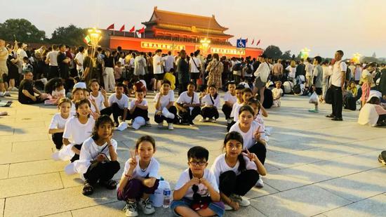 新疆兵团第六师五家渠市带队干部何沐韩说:“这些同学第一次去北京特别开心,当五星红旗升起的时候,大家怀着崇敬的心情高举右手敬少先队队礼,一起高唱国歌,孩子们的爱国情怀在那一刻体现得淋漓尽致。”