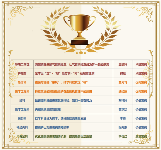 妇科《改善妇科肿瘤患者就医体验,我们一直在努力》、医学工程科《内窥镜质量控制管理》、医务科《以学科建设为抓手,助推医院高质量发展》、神经内科《提高护士对患者病情知晓率》荣获“价值案例”;