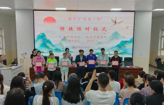 8月29日,第一师三团中学举行第三届“青蓝工程”师徒结对仪式,共有19位优秀教师与20位新入职教师结成师徒,共同开展教学和教研工作。