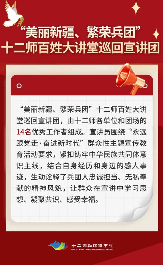 连日来,“美丽新疆、繁荣兵团”新疆生产建设兵团第十二师百姓大讲堂巡回宣讲团走进各团场、企业、工厂等地,以“宣讲 视频”的形式,将新时代兵团建设成果与人物风采故事送到群众家门口。
