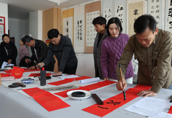 中新网兵团新闻1月16日电(刘万乐 王宇娜)在新春佳节即将来临之际,1月15日,被誉为“香梨小镇”的新疆生产建设兵团第二师铁门关市(以下简称“师市”)二十九团博古其镇老年书画协会联合该团镇总工会、师市党委组织部(老干局)、师市老干部书画协会共同开展“笔墨凝香送祥瑞、情暖万家迎新春”写春联送祝福主题活动,书法爱好者们挥毫泼墨,笔走龙蛇,一副副寓意喜庆、吉祥的春联在他们的笔下跃然纸上。
