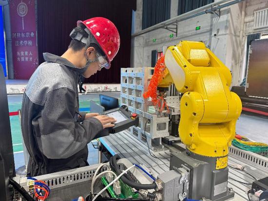 通用机电设备安装与调试比赛现场,选手正在操作机械臂。史达 摄