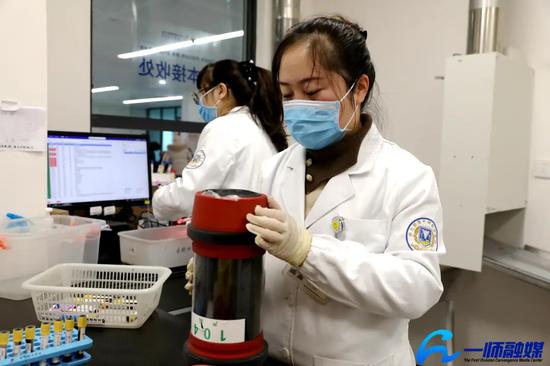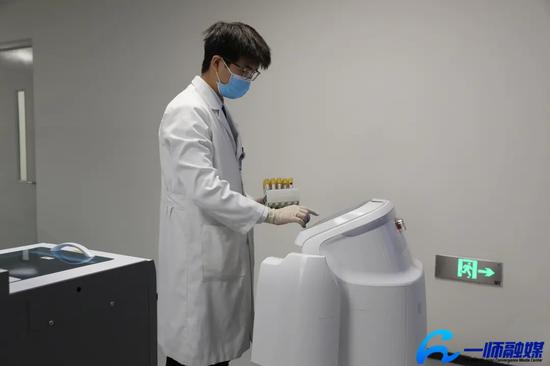 检验科医生从智能物流配送机器人“大白”放置仓取标本做检测。
