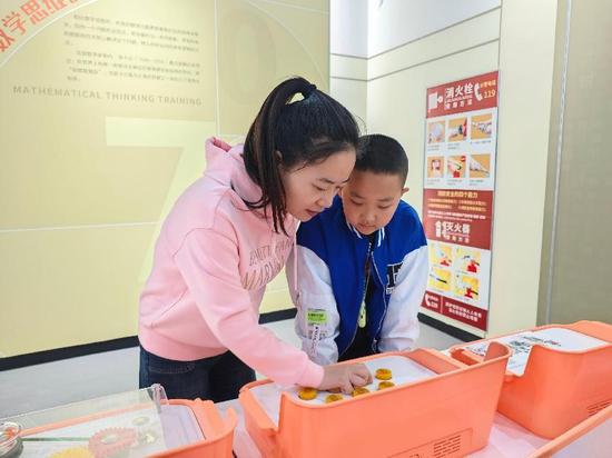 “数学思维”训练区域吸引众多孩子和家长参观体验,训练数学思维逻辑能力。王芳芳 摄