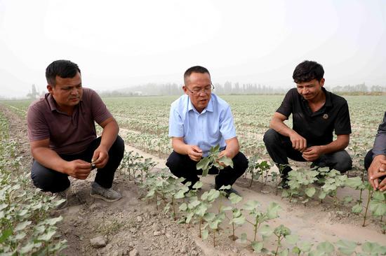 吕培贵(中)给阿瓦提县多浪乡英买力村村民讲解棉花田管注意事项。林国强 摄
