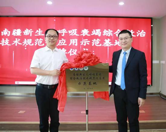 接着,马涛院长与高志刚副院长共同为《南疆新生儿呼吸衰竭综合救治技术规范化应用示范基地》揭牌。