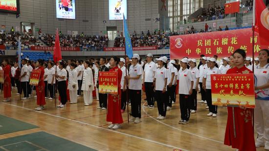 8月31日,“兵团石榴花 南疆民族情”中华民族传统体育邀请赛在新疆阿拉尔市体育馆举行开幕式。