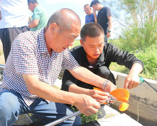 中新网兵团新闻6月16日电 (张燕兵)“上口宽3米,下口宽0.49米,渠深0.98米,水深0.36米……”6月13日,在新疆生产建设兵团第四师67团27干渠3号测点,伊犁河灌区技术员沈东海,点开手上平板电脑中一款app开始操作,每秒0.58立方米的瞬间流量立刻测算出来。