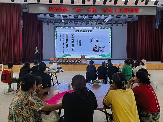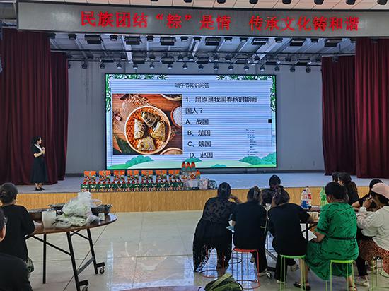 “节分端午自谁言,万古传闻为屈原”。在煮粽子的同时,53团第二小学老师田宏杰从屈原开始,为大家讲述端午节由来、别名、习俗等故事和知识,并邀请群众诵读《楚辞》名句,在有奖问答环节,群众积极参与,争着抢答,唯恐落后。