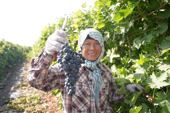 中新网兵团新闻9月13日电(施强 蔡旭虹)喜看枝头千粒珠,又是一年丰收时。初秋已至,但气温仍未降低,新疆生产建设兵团第十二师二二二团各连队种植的酿酒葡萄,经过长达6个月的生长,终于迎来采摘季,在各连队的葡萄地,职工们忙忙碌碌采摘葡萄,一派丰收的景象。