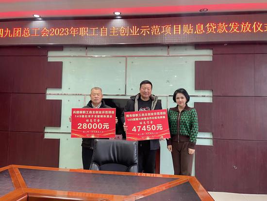 12月5日,一四九团总工会举行了2023年度职工自主创业示范项目贴息贷款发放仪式。团党委副书记、副政委、工会主席姜珊珊出席并讲话。