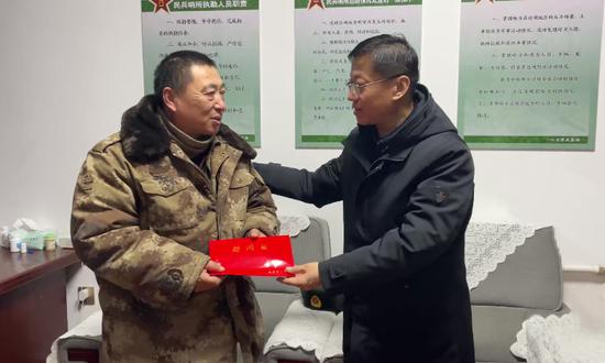 在祖国版图的最西北端,大地银装素裹,全国劳动模范、十师一八五团职工马军武夫妻依然驻守在阿拉克别克界河边的桑德克哨所,默默履行着“一生只做一件事,我为祖国当卫士”的庄严承诺。1月17日,兵团总工会党组书记、主席李江一行,带着兵团党委的殷殷嘱托、工会组织的诚挚问候和各族职工群众的美好祝福,看望慰问了巡边守水的马军武夫妇,甘于寂寞,以哨所为家,三十多年如一日,风雨无阻地在边境一线履行屯垦戍边职责使命表示由衷敬佩,叮嘱他们要保重身体、注意安全,遇到困难及时向组织反映。“感谢党和工会组织对我们的关心爱护,这些年来,生活虽然枯燥,但我们居住和生活的条件有了很大的改善,各种物资保障也十分充足,请大家放心,我会一直守护在界河边。”马军武说。
