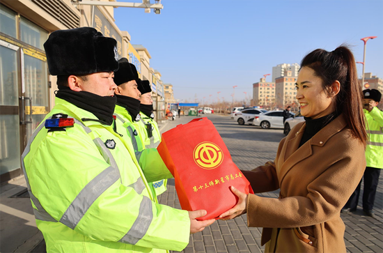 1月10日,是第四个中国人民警察节,十三师新星市总工会的干部亲手把暖手宝递送到正在一线执勤的哈密垦区公安局交警大队王警官手中,王警官说:“小小的暖手宝握在手中,却是暖在了我们的心里。我将不忘初心、牢记使命,以更加饱满的精神状态投入执勤值守,持续做好道路交通管理工作,为人民营造安全畅通的出行环境,为经济社会高质量发展保驾护航。”
