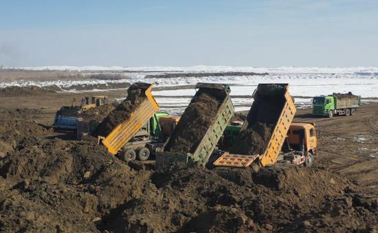 皮山农场跃进水库挖掘机、运输车来回穿梭 挖土运土。张芳军 摄中新网兵团新闻2月21日电(张芳军 刘茹)新疆生产建设兵团第十四师皮山农场跃进水库始建于1958年,是一座以灌溉为主的综合型水库。经过多年运行,水库淤积严重,有效库容仅为400万立方米。为增加水库的蓄水量,皮山农场启动跃进水库清淤工程,今天的新春走基层,我们一起去现场看一看。