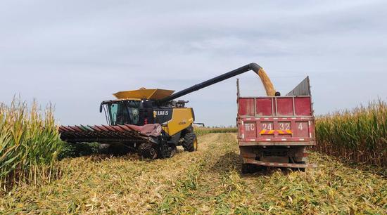 中新网兵团新闻9月3日电(李倩 孙亚玲 夏榆萍)金秋9月,新疆生产建设兵团第八师一四一团万亩籽粒玉米陆续收割,走进田间地头,一派繁忙热闹的景象。在金黄的玉米地,飘散着一阵香甜的气息,职工群众的笑脸和金黄的玉米相辉映,绘就一幅动人的丰收画卷。