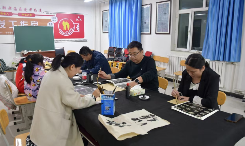 北社区居民活动中心,全团书法爱好者都聚集在此,认真临摹书法帖。据了解,书法练习的消耗材料由团场妇联和工会提供,每周三进行线下授课,周四进行线上直播授课。