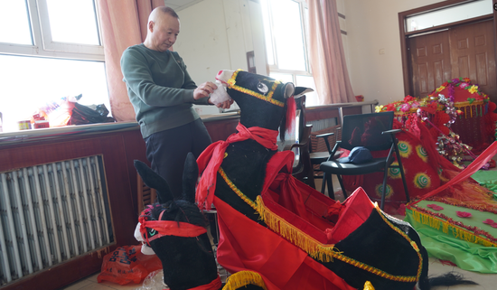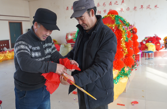 王富红主动承担起制作旱船的工作。他将采购的、自带的材料一一规整好,开始制作旱船,先用檩条扎制船骨,再安装部件,最后将灯笼、彩带、彩花等一一挂上去,用了不到一天时间,做出了一只既结实又漂亮的旱船。本着勤俭节约的原则,大家纷纷化身能工巧匠,拿起胶棒、针线、扎带、铁丝,把往年破损的道具,能粘贴的粘贴、需缝补的缝补,憨态可掬的小驴子、扎红绸带的旱船桨,焕然新生的出现在他们手中。