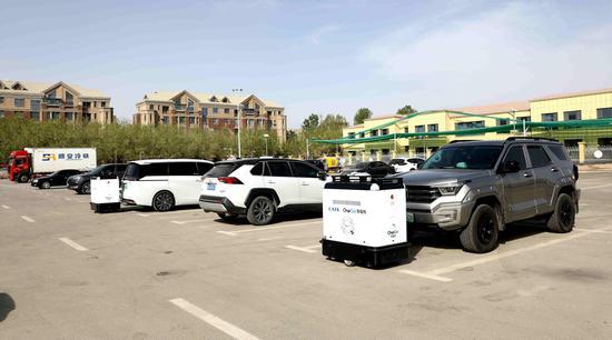 在阿拉尔市一商业停车区,3台汽车用移动式“充电狗”摆在显眼位置,工作人员正在做最后的调试。市民刘新涛通过手机扫码,在工作人员的操控下,不到两分钟,移动式“充电狗”就来到了他的车前,为车辆充电。