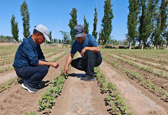 5月14日,在第八师一四九团16连7号条田,一株株翠绿的棉苗破土而出,舒展着叶片,在微风中轻舞。16连党支部书记吴中琪和连队两委正在查看棉花长势情况,棉田中一派生机勃勃景象。