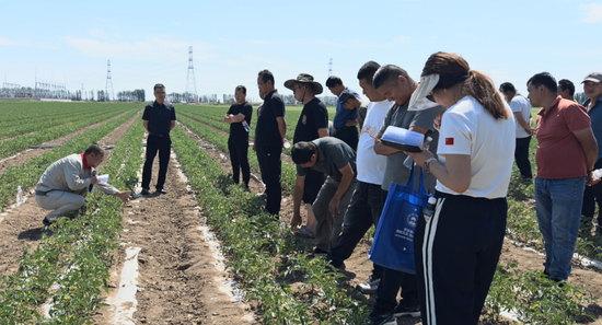 中新网新疆新闻5月22日电(李全山)5月22日,在新疆兵团第八师一四九团8连27条田番茄地里,放眼望去,黄花遍地,酱用番茄普遍进入初花期。来自新疆东方驼铃食品有限公司原料部经理杨亮正在给种植酱用番茄的连队书记(连长)、分管生产的两委、技术员、番茄种植户,就近期番茄田间管理进行现场培训。团长范永兵参加了培训。