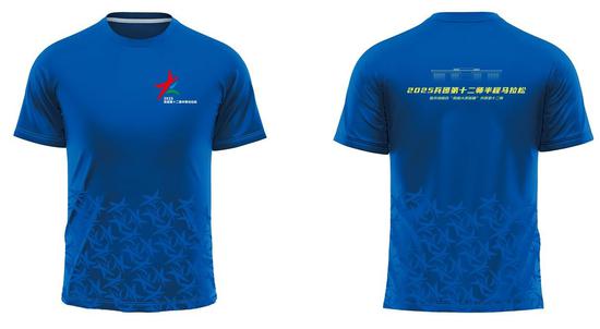 参赛服为速干布料,主体蓝色清新且富有活力,契合马拉松运动的蓬勃朝气;采用渐变式logo设计以抽象星云纹样呈现,象征参赛者突破自我的攀登精神。背面特别融入兵团第十二师市民中心建筑剪影,以简约线条勾勒城市地标,又构建起赛事与城市的文化纽带。