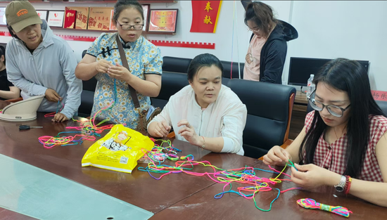 知识竞答余热未散,非遗手作体验区已在团结社区活动室展开。香囊制作台前,针线穿梭、香料氤氲,职工们跟着非遗传承人王兰花老师学习缝制“平安葫芦”香囊,有人因针法不熟练急得直冒汗,有人则巧手翻飞,很快完成精美的作品;五彩绳编织区,红、黄、蓝、白、黑五色丝线在指尖翻飞,居民们互相请教编法老师毛亚琼,“老师,这个吉祥结怎么打?”“我来教你!”此起彼伏的交流声中,一个个寓意祈福纳吉的五彩绳手链新鲜出炉。