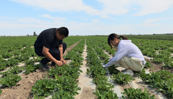 中新网兵团新闻6月12日电(李全山)6月12日,在新疆生产建设兵团第八师一四九团7连4条田花生田里,党支部书记王牧原正与连队两委俯身田间,仔细查看花生长势。眼下,全团1.8万亩花生已普遍进入开花下针期,放眼望去,绿意盎然的花生苗间,朵朵嫩黄的鲜花竞相绽放,长势格外喜人。