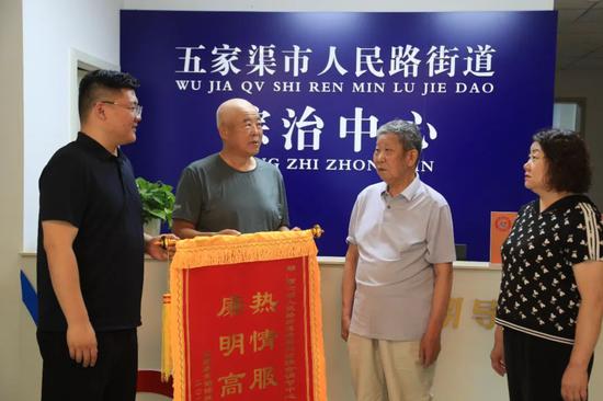 6月18日,市民郭俊武和蒋明华将写有“廉明高效 热情服务”的锦旗送到人民路街道综治中心,致谢工作人员快速解决纠纷难题。