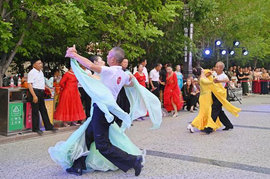 中新网新疆新闻6月26日电(张洁瑞)6月25日,交谊舞大赛在新疆生产建设兵团第八师一四一团步行街火热开赛。来自镇区及周边团场的交谊舞爱好者齐聚于此,他们身着华服,满怀热情,为观众带来一场视觉盛宴。