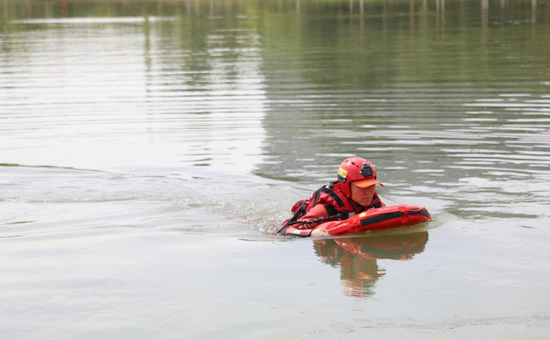 演练现场,救援人员展开了急流救援、城市排涝等实战演练,其中,新配备的水上救援机器人成为演练亮点。在救援人员的遥控操作下,水上救援机器人就像一艘小艇快速驶向落水群众,落水群众趴在机器人上被带向岸边。
