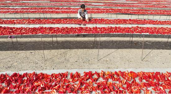 中新网兵团新闻7月23日电(白克斌 张海霞)7月23日,新疆生产建设兵团第二师二十一团三连职工张桂梅抢抓晴好天气,将切好的“新乡四号”(四平头辣椒)均匀地铺在戈壁滩上的晾晒架上,一行行、一列列成一片暖色,构成戈壁滩一道独特的夏日风景线。