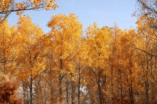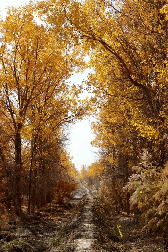 至今,在胡杨林中依然可以看见地上白白的盐碱,像是下了一场大雪,盐碱多的土地上其他树木难以生长,即便是这样的环境,胡杨也奋力生长着,在贫瘠的土地中汲取营养,等到秋天一来,树叶飘落到地上形成温暖的棉被,度过冬天后化作泥土滋养这片土地,成为大树的养料,胡杨种子则搭上秋风的快车到其他地方生根发芽。
