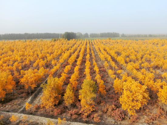 在新疆生产建设兵团第一师十六团七连有这样一片特殊的人工胡杨林,种植它的人有十六团各单位的职工群众,也有来自千里之外的上海知青,随着时光流逝,人们已经记不清楚这些树具体是哪一年种下,但440亩的胡杨林鳞次栉比,在阳光的照耀下散发着的金黄光芒,是无数人的团结奋进的劳动成果,毛志明就是其中一员。